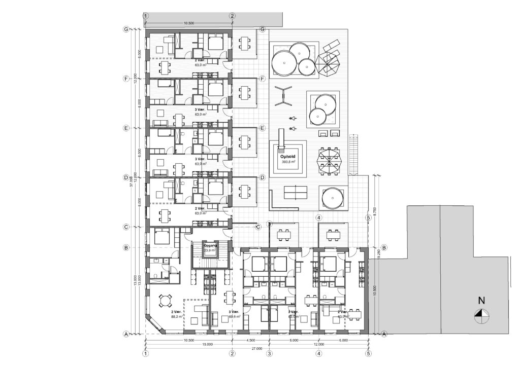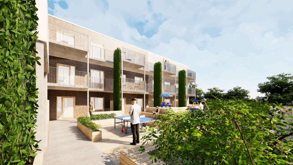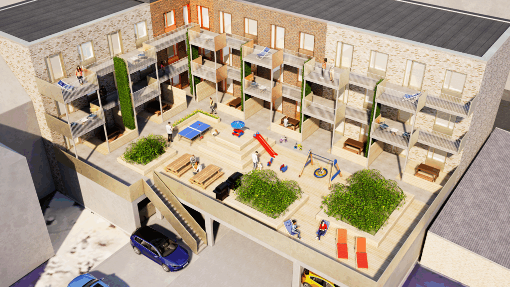 Lejlighederne på første sal vil få adgang til deres egne private haver, som ligger i forlængelse af det fælles terrassedæk, der fungerer som fælles opholdsareal med siddepladser, hvor beboerne kan mødes og skabe fællesskab.