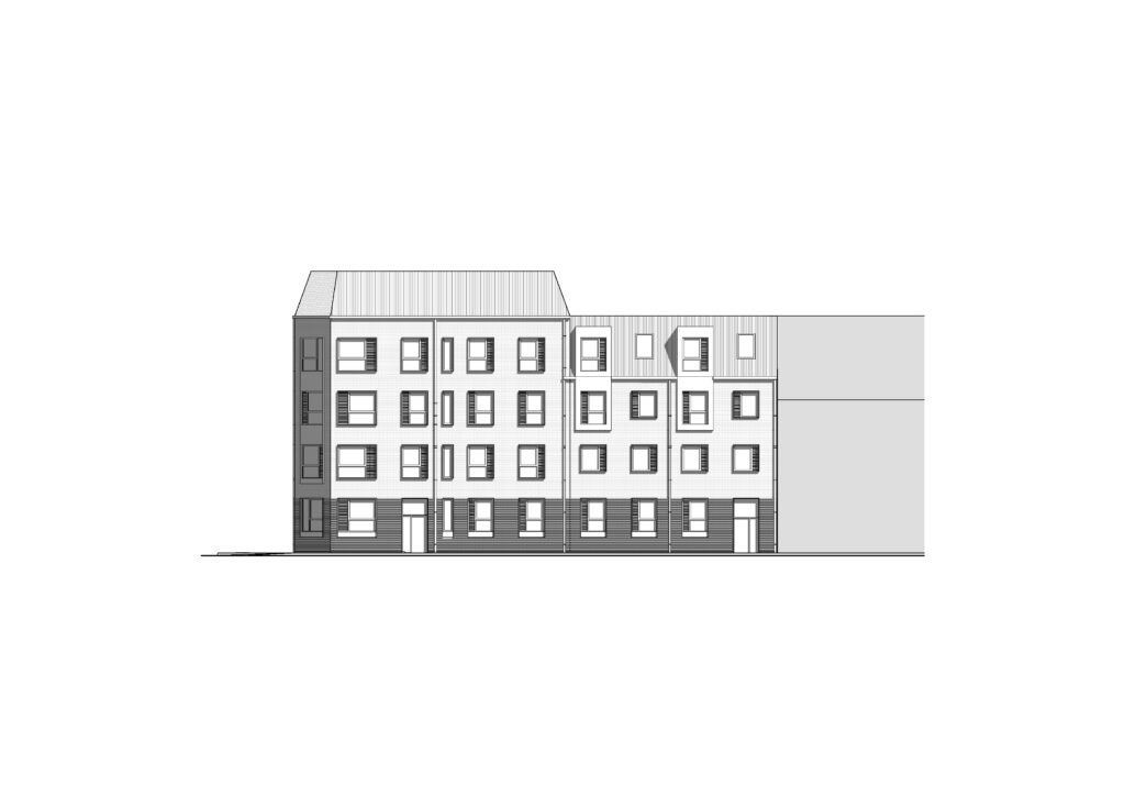 Bygningens facade vil blive opdelt i mindre enheder, der ligner individuelle byhuse. Materialeskift og variation i mønstre vil få disse enheder til at fremstå som selvstændige huse, der står side om side. Denne opdeling nedskalerer bygningen og skaber en menneskelig skala, som er tilpasset de øvrige bygninger langs vejene.