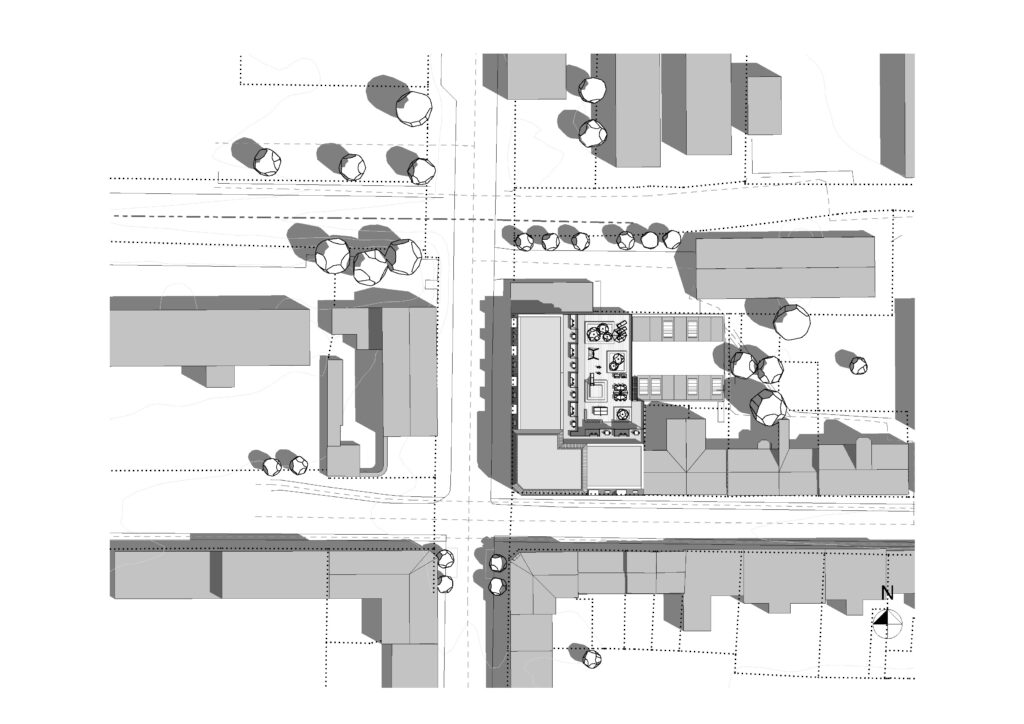 Bygningen vil blive placeret på den nuværende tomme grund som en afslutning af det omkringliggende byrum. Med sin karrestruktur og det markante hjørne vil bygningen både relatere sig til de omkringliggende bygninger og samtidig definere krydset og hjørnet på en måde, der forstærker byens rumlige udtryk. Den karakteristiske afskæring af hjørnet vil skabe en blød overgang omkring bygningen, hvilket tilfører hjørnet den særlige dynamik som kendetegner Fredericia hjørnet.