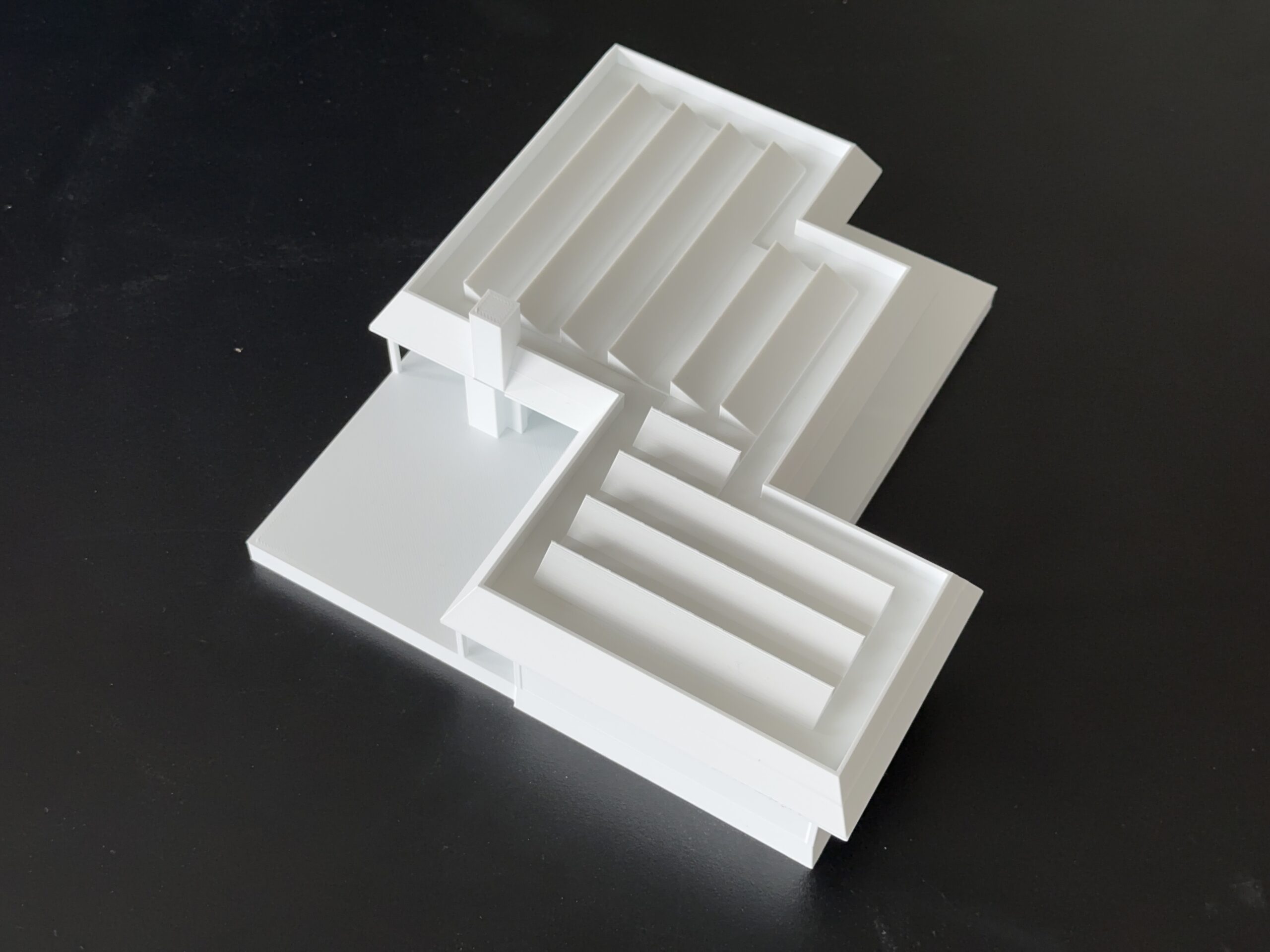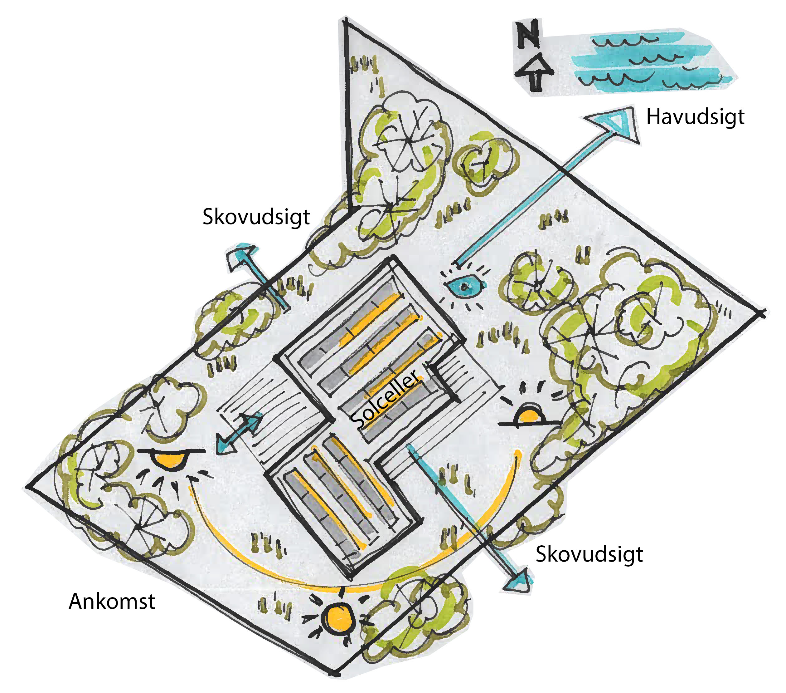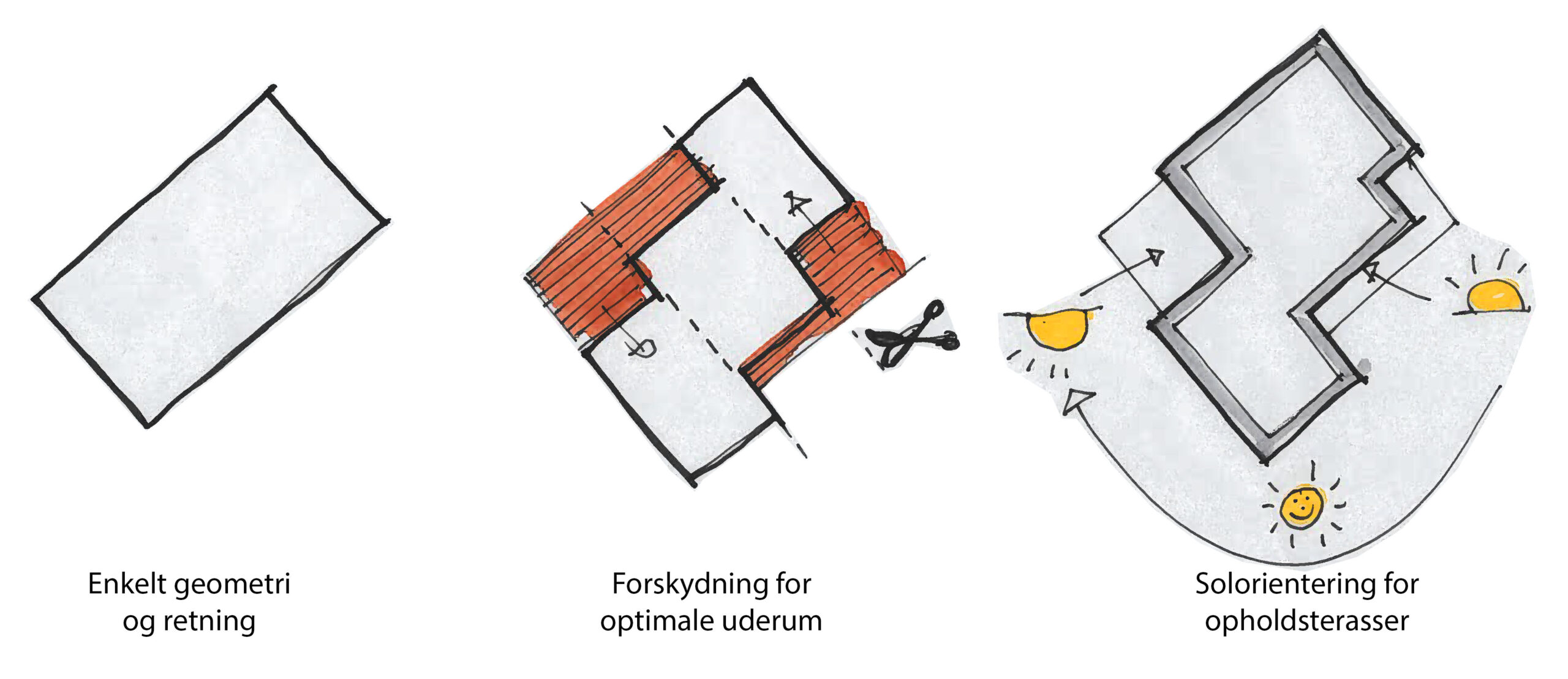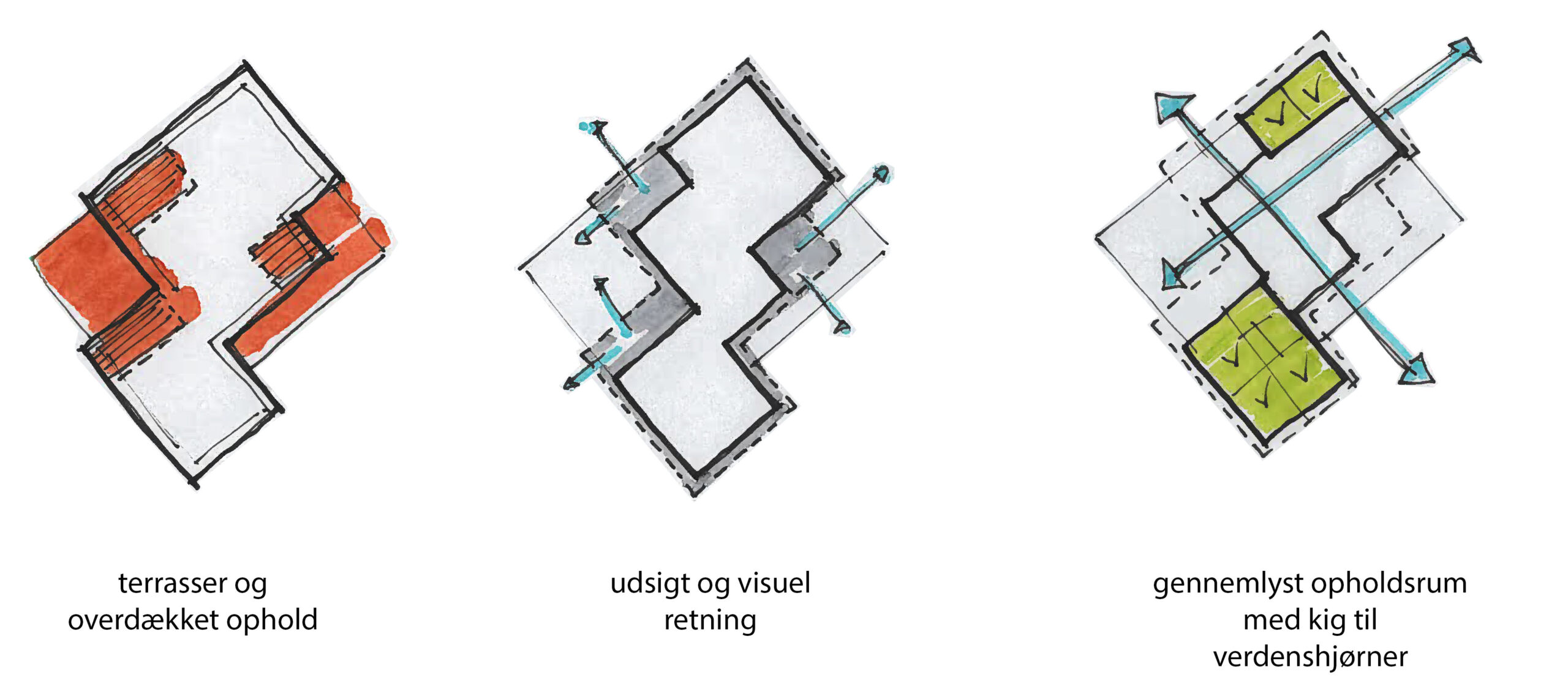 Sommerhuset er disponeret i tre forskudte volumener, der giver bygningen karakter og formidler overgangen mellem ude og inde. Forskydningerne danner naturlige terrasser på begge sider af huset – solrige opholdszoner der smelter sammen med de indre opholdsrum og skaber en flydende overgang mellem arkitektur og natur.