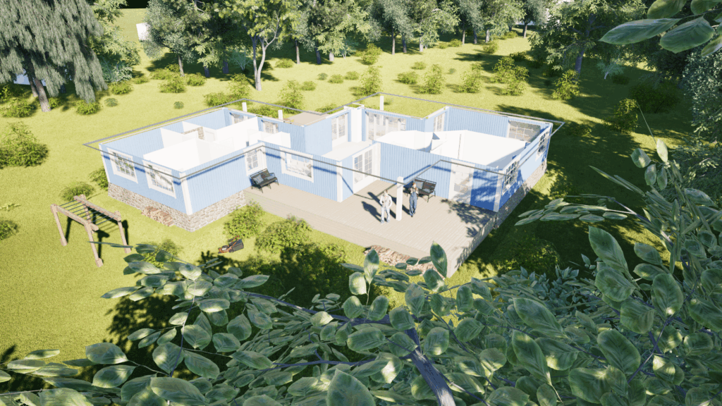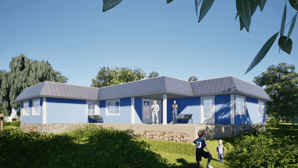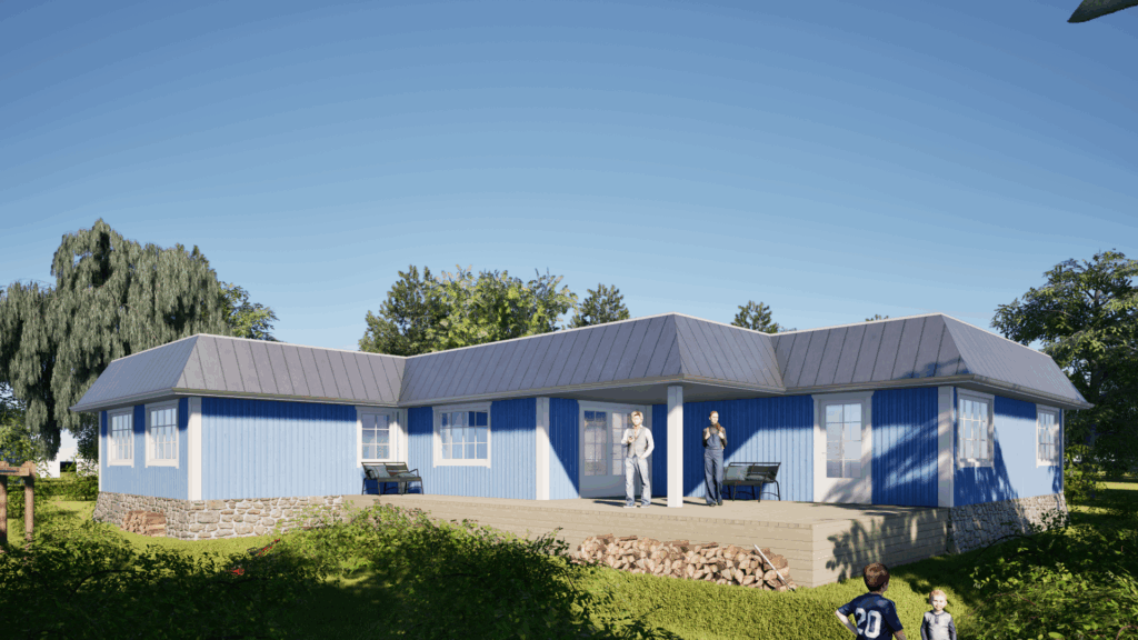 Indvendigt er huset organiseret med værelser i de nordlige og sydlige fløje, mens det centrale opholdsrum – køkken, spiseplads og stue – ligger i hjertet af huset. Forskydningen i planen skaber dynamiske kig og bringer dagslys ind fra alle sider. På den måde er huset både robust og let, beskyttet og åbent – tilpasset stedet og med blik mod fremtiden.
